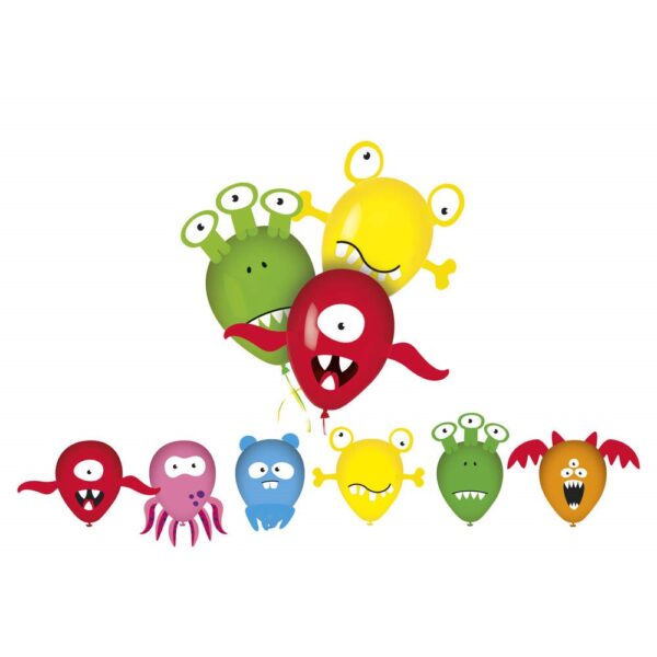 Sada latexových balonků MY PARTY Monsters pro Vaše oslavy a party. Sada obsahuje 6 ks kvalitních a zdravotně nezávadných balónků pestrých barev a 6 sad obrázků, které umožňují vytvořit obrázek příšerky. Sada obsahuje rovněž samolepicí štítky pro upevnění vystřihovánek na nafouknutý balónek. Pro nafukování doporučujeme používat pumpičku, která je rovněž součástí sortimentu.