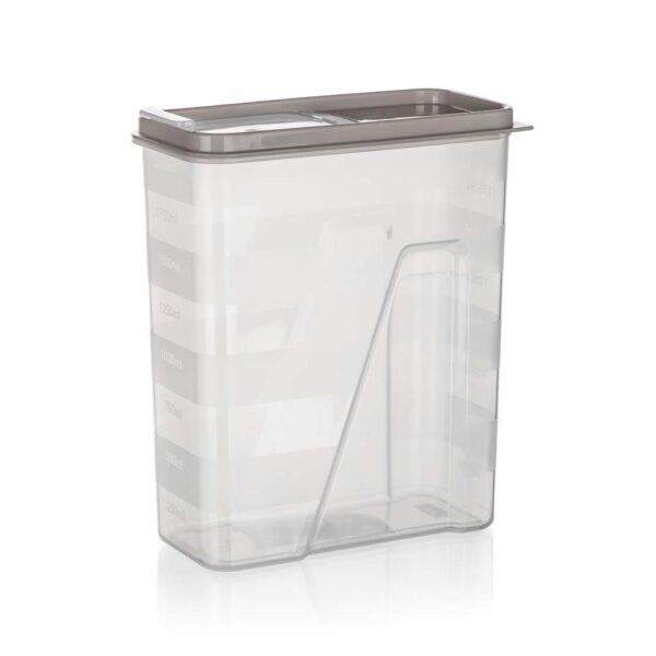 Transparentní dávkovací plastová dóza Culinaria o objemu 2 l, s víčkem v latte barvě. Dóza je praktickým pomocníkem na ukládání těstovin, luštěnin, mouky a jiných potravin. Opatřena měřící ryskou s odstupem 250 ml.