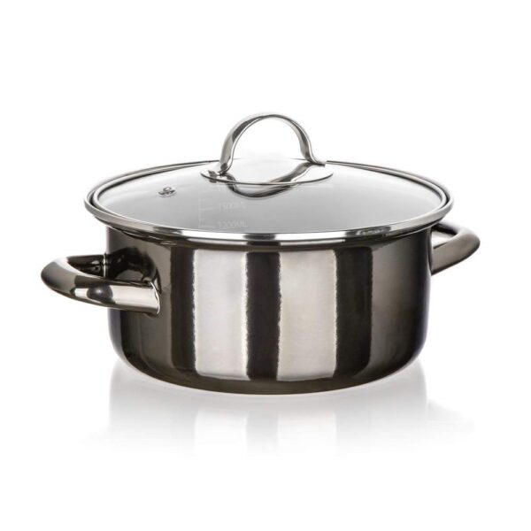 Smaltovaný hrnec METALLIC Black 2 l, se skleněnou poklicí. Rozměry: průměr 20 cm, výška (bez poklice) 9 cm. Barevné provedení černá metalíza. Hrnec lze používat na všechny typy varných desek včetně indukce.