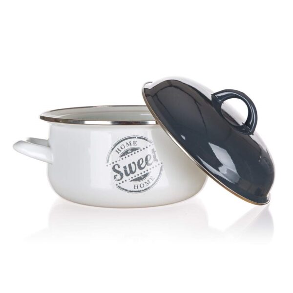 Smaltovaný kastrol o průměru 24 cm v bílé barvě s dekorem SWEET HOME a s poklicí v šedé barvě je vhodný na vaření různých pokrmů. Můžete mýt v myčce na nádobí. V nabídce máme další produkty z kolekce SWEET HOME.