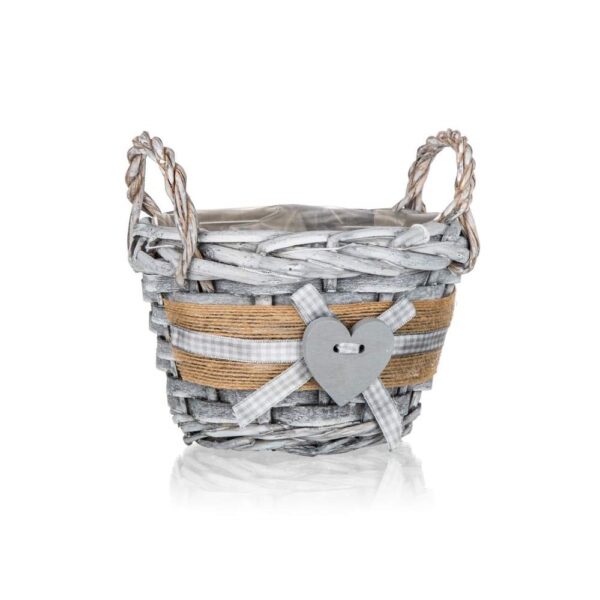 Košík proutěný s uchy o rozměru 14×10 cm je vhodný pouze pro dekorativní účely. Dodáván v šedé barvě kulatého tvaru s dekorem srdce, uvnitř igelit.