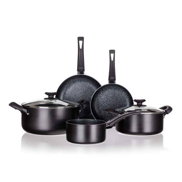 Sada hliníkového litého nádobí BLACK STONE 7 ks, obsahuje: rendlík 16 cm, hrnec 20 cm se skleněnou poklicí, hrnec 26 cm se skleněnou poklicí, pánev 20 cm a pánev 26 cm. Vše má plně indukční dno, bakelitové rukojeti se soft touch povrchovou úpravou. Nepřilnavý povrch je velmi tvrdý a odolný proti poškrábání. Výrobky v sadě jsou odolné proti nárazu a deformaci tvaru. Vysoká tepelná vodivost zajišťuje rychlé a ekonomické vaření – dlouho drží teplotu.