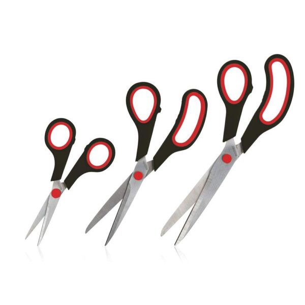 Sada nůžek pro domácnost CULINARIA – 3 ks, v barevné kombinaci černá / červená, rozměry – 24 / 21 / 14 cm. Praktická sada obsahuje dvoje větší a jedny menší nůžky, které naleznou uplatnění v každé domácnosti. Nůžky jsou vyrobeny z kvalitní oceli, kterou lze ostřit a zaručuje dlouhou životnost a použitelnost nůžek.