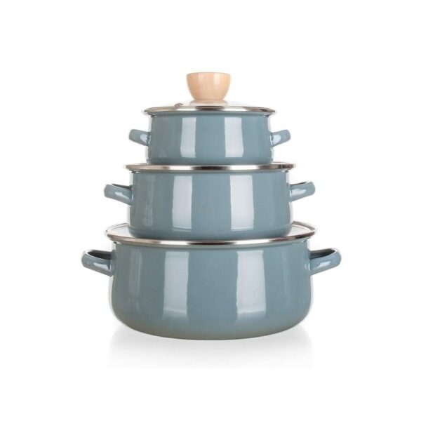 BANQUET Sada smaltovaného nádobí NATURAL Olive, 6 ks 6dílná sada smaltovaných hrnců se skleněnou poklicí NATURAL OLIVE, vhodné na vaření různých pokrmů. Hrnec můžete použít do trouby, bez skleněné poklice, která je opatřena dřevěným knobem. Sada obsahuje: hrnec 14 x 7 cm, 18 x 8,5 cm, 22 x 10,7 cm. Hnrce mají 2vrstvý smaltovaný nástřik SOLID barva v přírodním odstínu olivy. Potisk dna obsahuje opdovídající piktogramy.