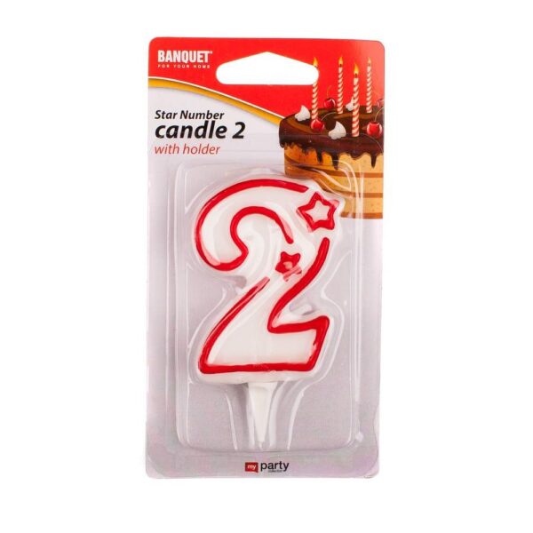 BANQUET Svíčka narozeninová č.2 MY PARTY 7 x 4,5 cm Narozeninová svíčka číslo 2, součastí svíčky je plastový bodec. Rozměry: 7 x 4,5 cm. Výrobek využijete na zahradní párty, pikniku apod.
