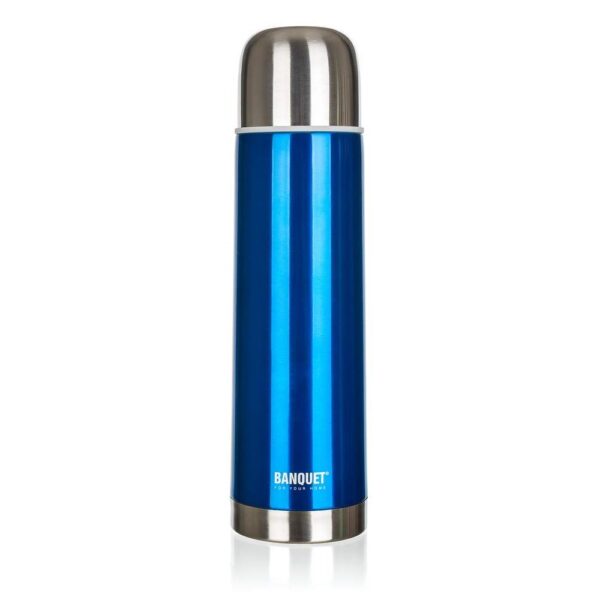 BANQUET Termoska nerezová AVANZA Blue 0,5 l Nerezová termoska AVANZA Blue 0,5 l ve dvouplášťovém provedení, je vhodná pro horké a studené nápoje. Vnější strana je opatřena metalickým povrchem. Plastový uzávěr – clip pro snadné použití (jedním stiskem se termoska otevře, druhým zavře), víčko termosky lze použít jako pohárek na pití. Nerezové termosky jsou velmi odolné a bezpečné, nehrozí rozbití vložky či opaření při manipulaci. Teplotní pokles je závislý na teplotě nápoje při plnění, množství nápoje a teplotě okolí.