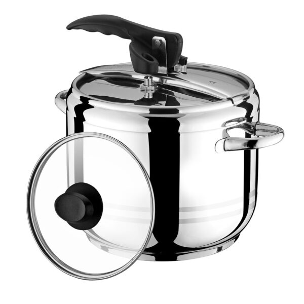 Nerezový tlakový hrnec 5 l s pákovým uzávěrem a skleněnou poklicí, průměr 20 cm, nerez 18/0, 3 ventily, silné sendvičové dno. Víko obsahuje tři ventily oproti předchozím modelům, hlavní pracovní ventil, bezpečnostní ventil a silikonový ventil pod přítlačnou sponou pro úplně bezpečné použití. Pákový uzávěr je zabezpečený proti náhodnému otevření. Díky speciálnímu tvaru a bezpečnostnímu ventilu nelze tlakový hrnec během vaření otevřít. Tlakový hrnec je určen pro rychlou přípravu pokrmů a lze jej používat na všechny typy varných desek vč. indukce. Hrnec je v silnostěnném celonerezovém provedení, má silné sendvičové dno a lze ho používat na všechny typy varných desek.
