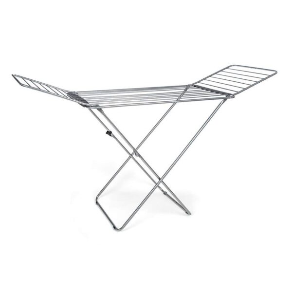 Stabilní přenosný sušák na prádlo nabízí cca 20 metrů sušící plochy, což představuje až dvě plné pračky prádla. Boční křídla jsou vhodná na sušení delšího prádla. Praktickým pomocníkem je držák na sušení ponožek. Velkou výhodou je stabilní konstrukce ze stříbrných trubek, doplněných plastovými držáky v šedé barvě. Bezpečnému použití napomáhá také dětský bezpečnostní zámek, omezující možnost nechtěného složení a případného pádu.